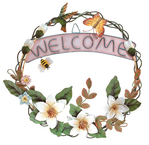 Item # 30341 A finely-crafted way to greet your guests,this "wire" technique wreath incorporates the bird and the bees amid its lovely flower motif.11" diameter. $14.95 |