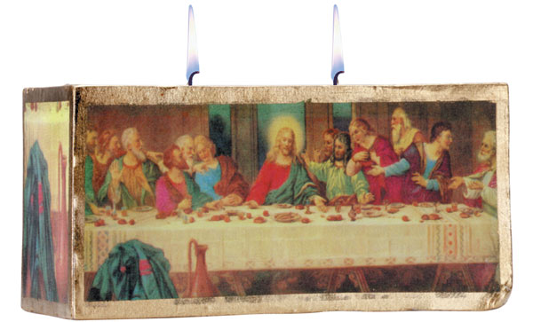 Item # 30749 NEW ! A rendition of the Last Supper covers the side of this vanilla scented, palm oil wax candle with gold border. 6" x 3" x 3" high. $9.95 Exclusive |