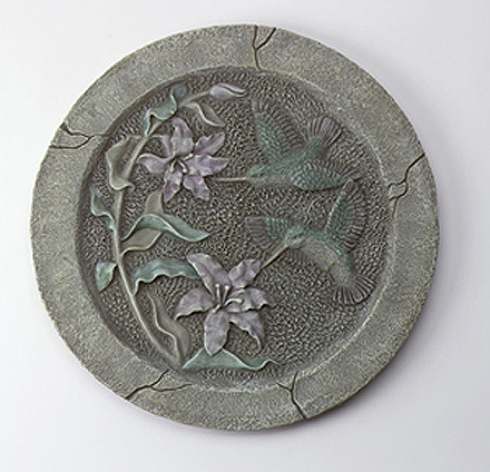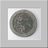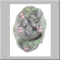 Item # 29090 This "hummingbird and flower" plaque with metal hanger is reminiscent of stone carvings from another time. It will fit well either indoors or out, and add a touch of the ages to your decor. 11 3/4" diameter x 1/2" thick. $11.95 |