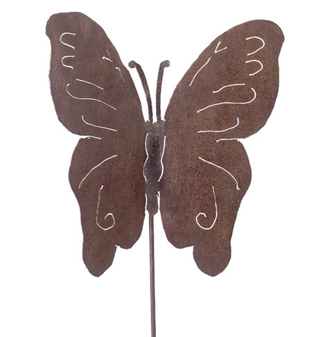Item # 29649 Be assured this lovely butterfly won't fly south for the winter, but will remain in your garden in all its uniquely'crafted, rusted-meatal glory. 13" x 13 1/2" high.Stick 28 1/4" long. $11.95 |