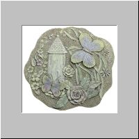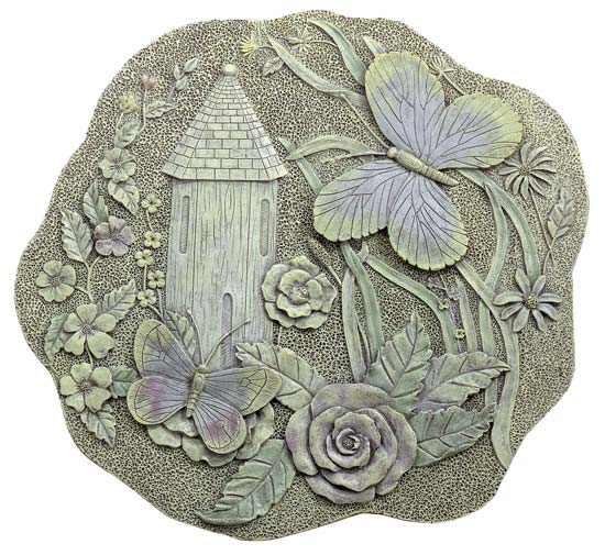 Item # 30155 Fluttering through the forrest, these butterfllies dicover a medieval castle among the flora. A lovely, antique-pastel, plaque appropriate for any garden. 11 1/4" x 11 1/2" x 3/4" thick. $11.95 |