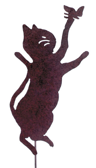 Item # 30784 NEW ! A feline pursuing one of its favorite pleasures, this rusted-metal technique sculpture will add whimsey to your yard. 7 3/4" x 16 1/2" high. Stick approx.28" long. $11.95 |