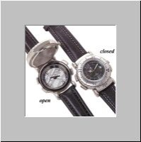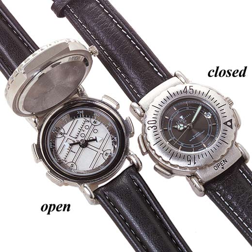 Item # 23912 Unique explorer's watch for men.Inset compass on a sturdy black leather band.Quartz, water-resistant. International times.Date display $49.95 |