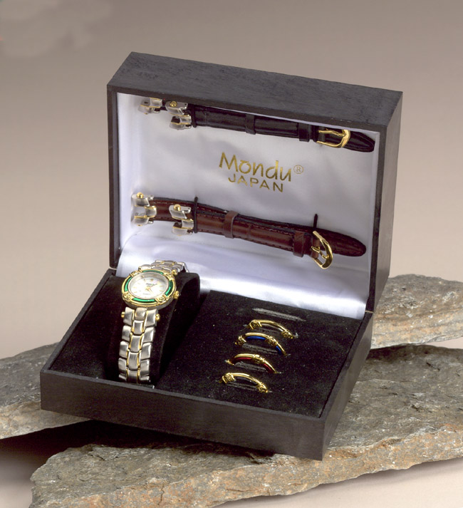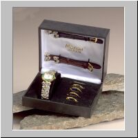Item # 28418 It's always the right time to wear this lady's watch,because you can mix and match its design to suit the occasion with three different bands and five different bezels. Quartz. $54.95 Set |