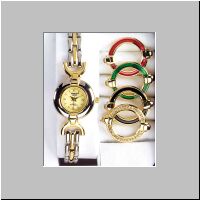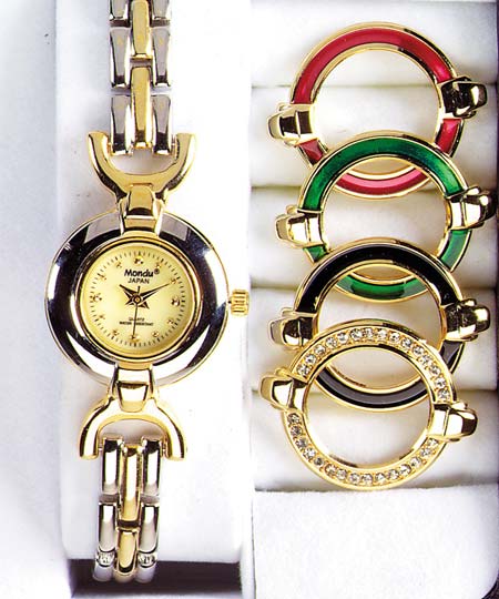 Item # 29522 Ladies, change your watch to fit your ensemble. Green, red, silver, black and simulated diamond bezels, 2-tone, link bracelet and "gold" dial. $47.95 |