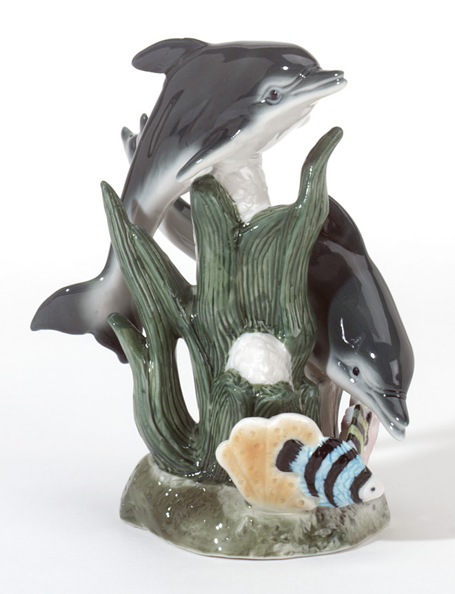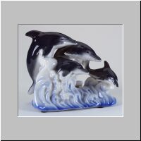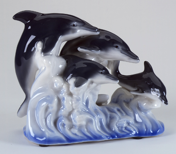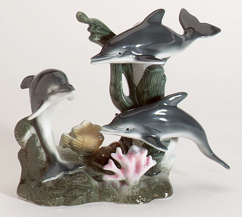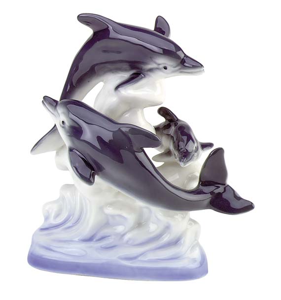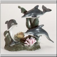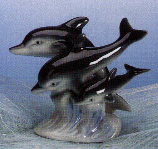 Item # 25632 A trio of happy dolphins frolic on the crest of a wave. Porcelain. 4 1/2"x3'x3 1/4' high. $5.95 |