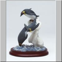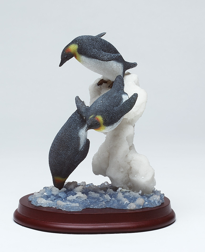 Item # 27144 Three penguins are dramatically captured mid-dive into icy Antartic water in this highly realistic portrait. Rosewood color base. 5 7/7"x5"x6 3/4 " high. $19.95 |