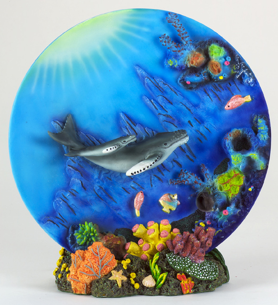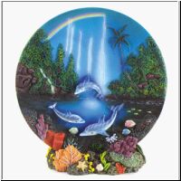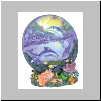 Item # 30078 Rising to greet the setting sun, a dolphin takes in lifegiving air before again plunging to the depths to commune with its friends. Seabed-design stand included. 3 1/2" diameter. $7.95 |