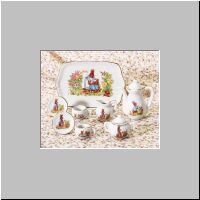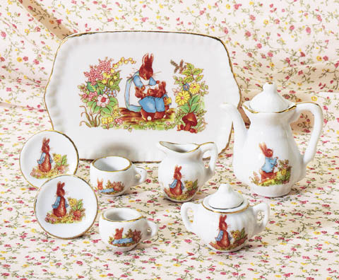 Item # 23773 A ceramic tea set with delicate, elaborate scenes of Mama Rabbit and her brood at home in the flowery meadow. Includes teapot, tray, cups saucers, creamer and sugar bowl. Tray is 23/4" high. Regular price: $9.95 Sale price : $8.45 |