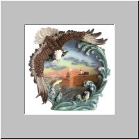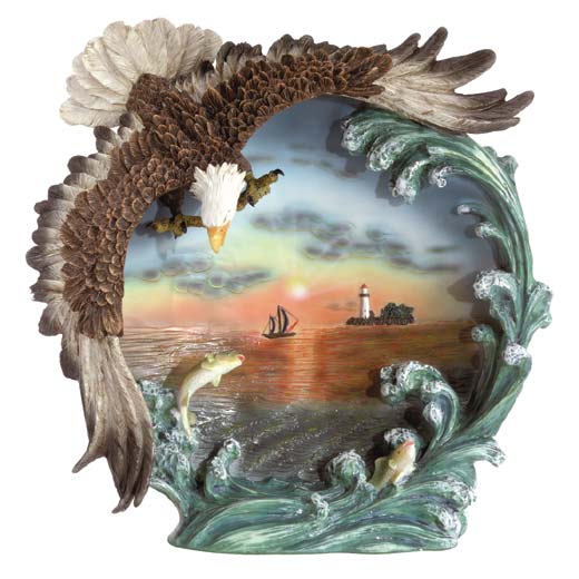 Item # 30724 NEW! Aiming toward a fine repast, the ferocious eagle dives toward the foam-filled sea and a duo of flavorsome fish on this 3-dimensional plate. 9 1/8" x 3 3/4" x 9" high. $24.95 Exclusive |